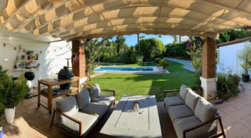 Fabulosa casa familiar en la exclusiva zona de Sotogrande. Esta villa de 5 dormitorios se encuentra en la playa de la carretera principal A7 y cerca de una serie de tiendas y servicios, así como la playa y el puerto deportivo de Sotogrande. La propiedad tiene una bonita entrada y camino de entrada, que conduce a un garaje privado y a la parte delantera de la casa, que da a la piscina bien cuidada y jardín. Hay varias zonas de estar al aire libre, donde se puede disfrutar del sol todo el día, o encontrar un poco de sombra muy necesaria en los calurosos meses de verano. Hay zonas chill out, zonas de comedor y un magnífico lugar para barbacoa y un horno de pizza al aire libre. La villa está excepcionalmente bien de precio y es perfecto, ya sea para una casa de vacaciones, o residencia familiar permanente.