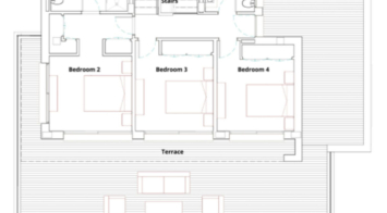 4 dormitorios dobles, 3 baños. 5 terrazas incluyendo azotea panorámica con ducha y tumbonas.