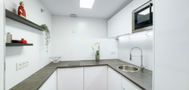 El salón es diáfano y ofrece mucho espacio de almacenamiento, mientras que el segundo dormitorio, separado del salón por una puerta corredera, tiene su propio cuarto de baño.