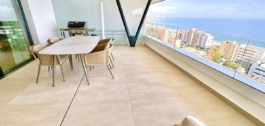 Impresionantes vistas panorámicas al mar y la costa desde su increíble terraza cubierta orientada al sur y solarium abierto con sauna propia y un montón de espacio para tumbonas, sala de estar, mesa de comedor, zona de barbacoa, etc., etc. para la vida de lujo y entretenimiento.