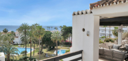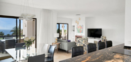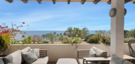 Este lujoso ático, situado en la prestigiosa Milla de Oro de Marbella, en el complejo Coral Beach, personifica la vida en primera línea de playa. La propiedad cuenta con tres amplios dormitorios y dos elegantes cuartos de baño, proporcionando un amplio confort y privacidad. Lo más destacado es una terraza de 74 m² con impresionantes vistas panorámicas al mar, ideal para comer al aire libre y relajarse. Los interiores están bañados en luz natural, complementada por una moderna cocina abierta con impresionantes vistas a la montaña. Los residentes disfrutan de acceso a exuberantes jardines tropicales, una gran piscina comunitaria y acceso directo a la playa. El ático también incluye aparcamiento subterráneo y trastero. Su ubicación privilegiada ofrece proximidad a restaurantes de renombre, hoteles de lujo y prestigiosos campos de golf, por lo que es perfecto para aquellos que buscan un estilo de vida sofisticado en Marbella.