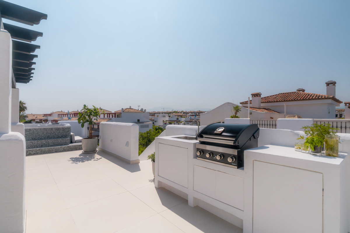 Arriba, la suite principal se extiende por toda la planta superior y cuenta con su propio cuarto de baño y terraza privada que conduce a un impresionante patio superior con jacuzzi y barbacoa, que ofrece vistas panorámicas y al mar, ideal para relajarse o entretenerse.