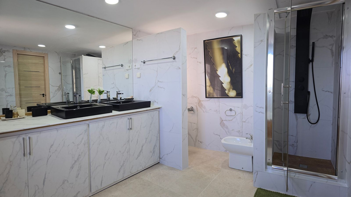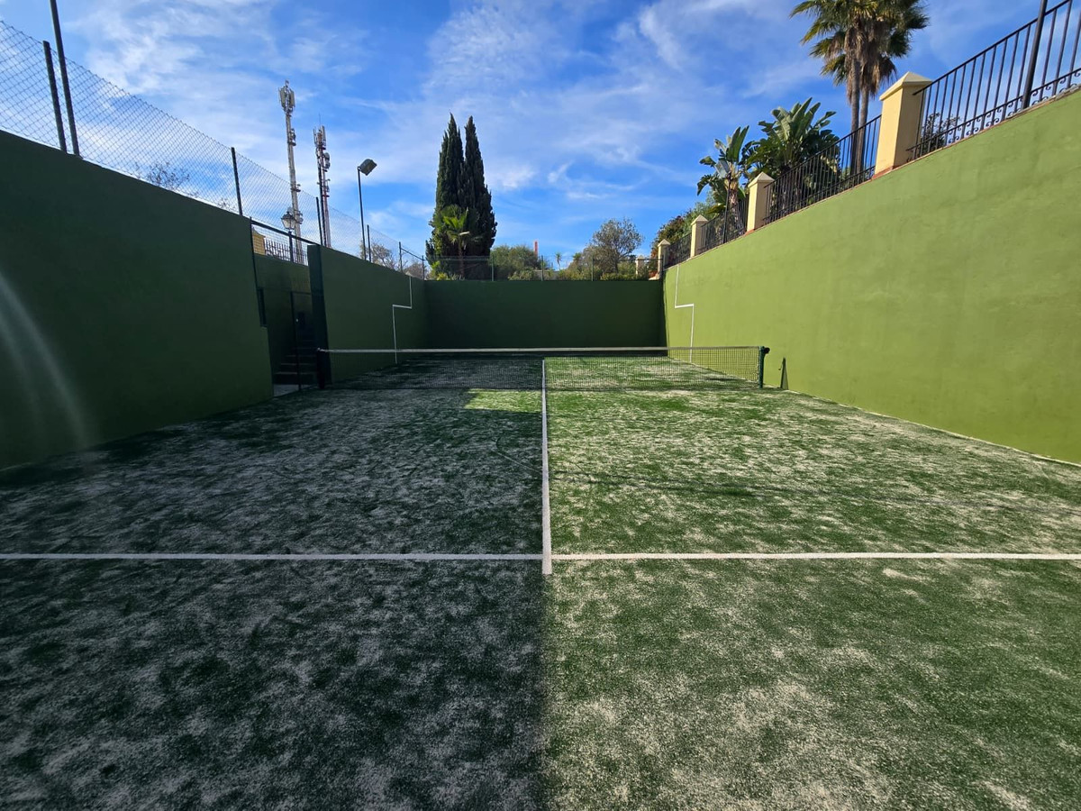 Ubicada en una pequeña comunidad con amplios terrenos, esta Semi-Villa de tres dormitorios + habitación extra, más una suite independiente, cuenta con una piscina de doble longitud, una pista de pádel y unas vistas impresionantes tanto del mar al sur como de la montaña de La Concha al norte. En el interior, encontrará suelos de mármol, aire acondicionado y calefacción central, un bar alto y una terraza perfecta para recibir invitados.