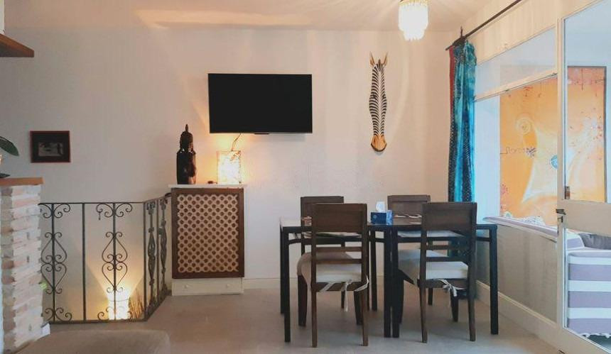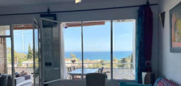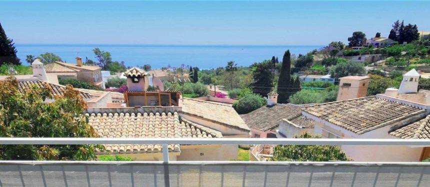 Chalet adosado con impresionantes vistas al mar en una tranquila urbanización de sólo 13 vecinos. Situada entre Torremuelle y Benalmádena Pueblo. A tan solo 5 minutos en coche de la playa (1,8km). Calle muy tranquila perfecta para vivir todo el año o para alquilar – la propiedad posee la licencia turística.