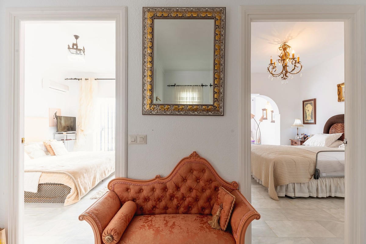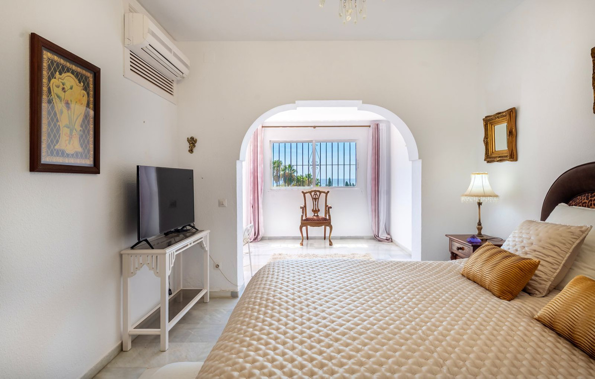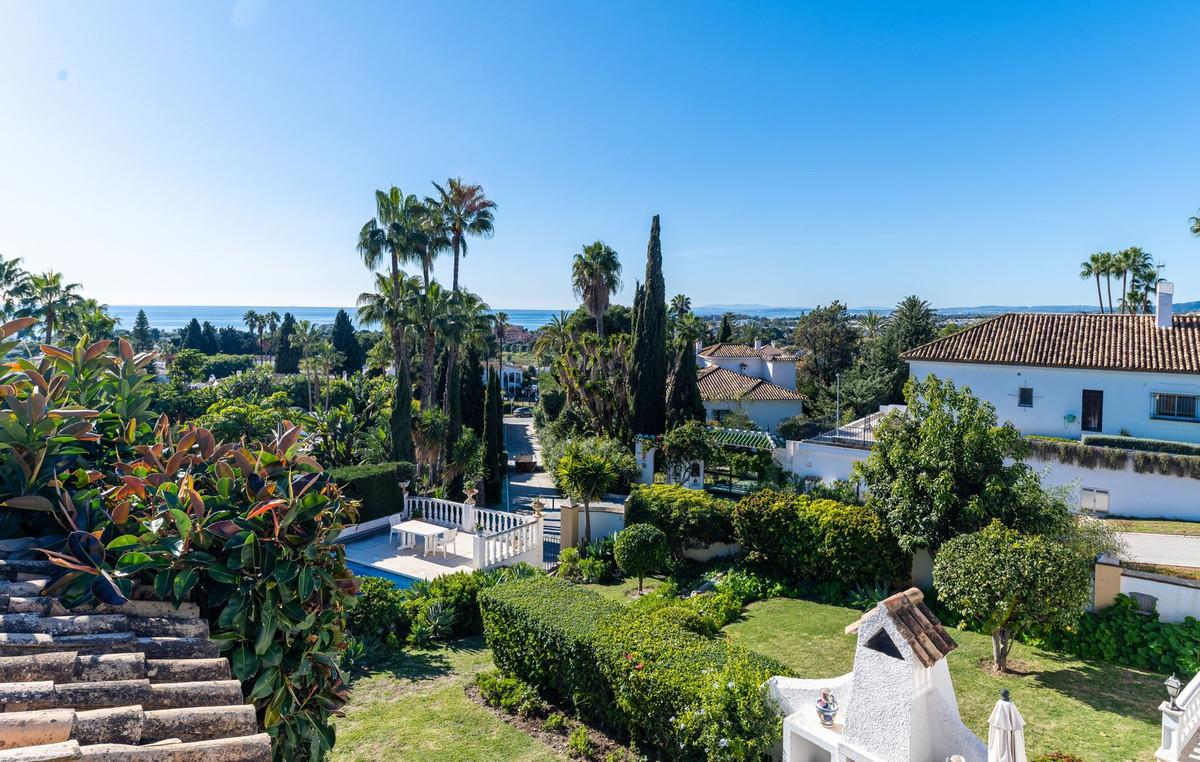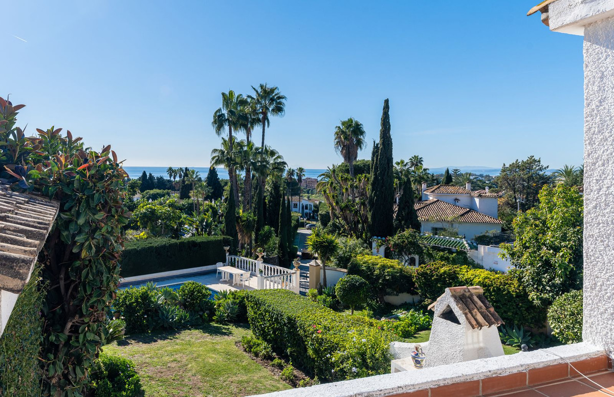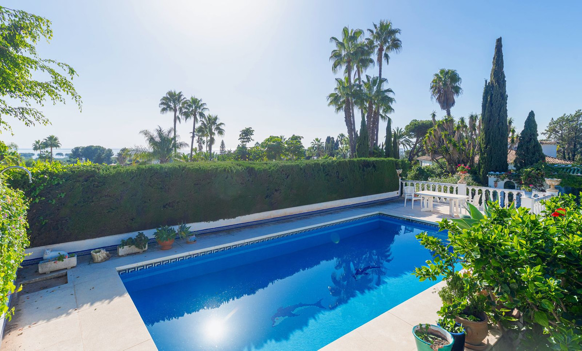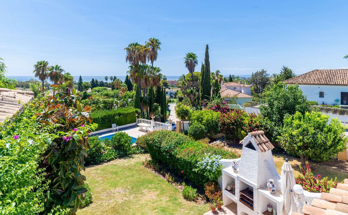 Exquisita Casa Clásica Andaluza con Vistas al Mar distribuida en 2 espaciosos niveles con un precioso jardín privado frente a la Piscina rodeado de vistas a múltiples Palmeras tropicales de gran altura. La distribución interior y exterior de las habitaciones ha sido diseñada por expertos para acentuar el envidiable carácter y ambiente floral andaluz y de múltiples palmeras con vistas panorámicas al mar en toda la casa. Situado en una calle residencial excepcionalmente tranquila y bordeada de palmeras tropicales en El Paraíso Medio, junto al famoso campo de golf de 18 hoyos de El Paraíso y a menos de 1 km del mar y de las exquisitas playas de Costalita.