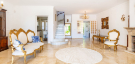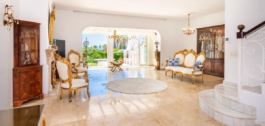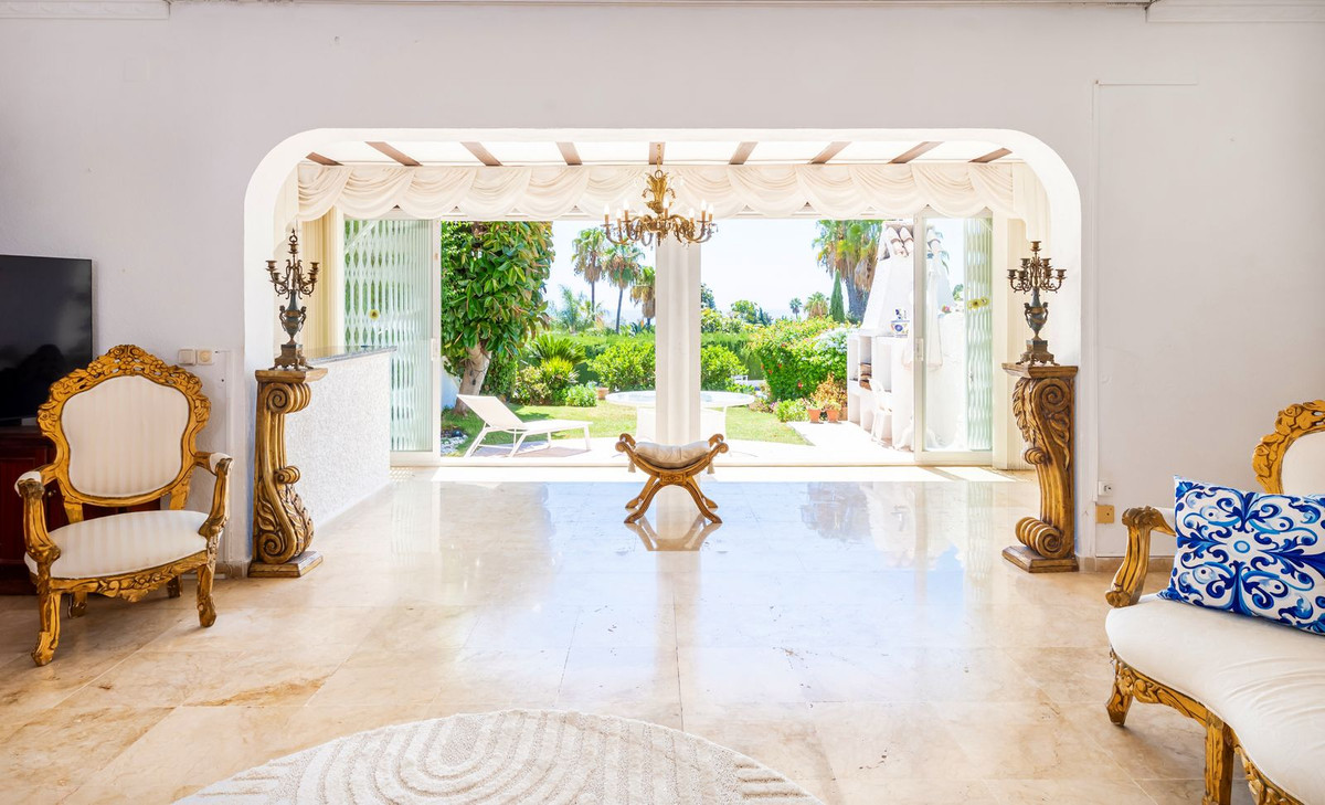 Desde la entrada un jardín privado cerrado complementa la parte delantera de la propiedad. El primer nivel de entrada consta de un pasillo que se abre en un salón excelentemente espacioso diseñado para el entretenimiento, comedor y relajación, con una impresionante chimenea de granito abierto en frente de la amplia zona de sofás y TV. Desde el salón se accede a una sala de cócteles diseñada a medida con vigas características en el techo que cuenta con una barra de bebidas integrada antes de la cena con taburetes altos y una barra de bar con más asientos chill out de relajación frente a la terraza exterior y el exquisito jardín al que se accede desde puertas correderas de pared a pared que ofrecen vistas de perfección absoluta del jardín con múltiples palmeras tropicales altas y vistas al mar Mediterráneo.