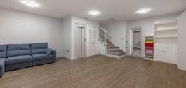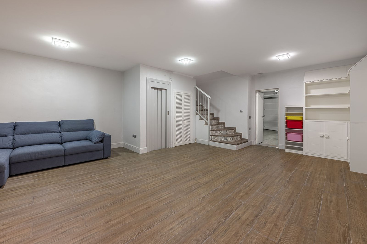 En el sótano, hay un salón o sala de juegos con luz natural y acceso directo a un garaje privado con espacio para dos coches.