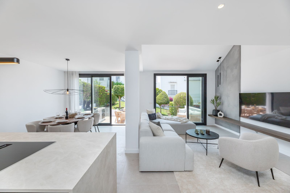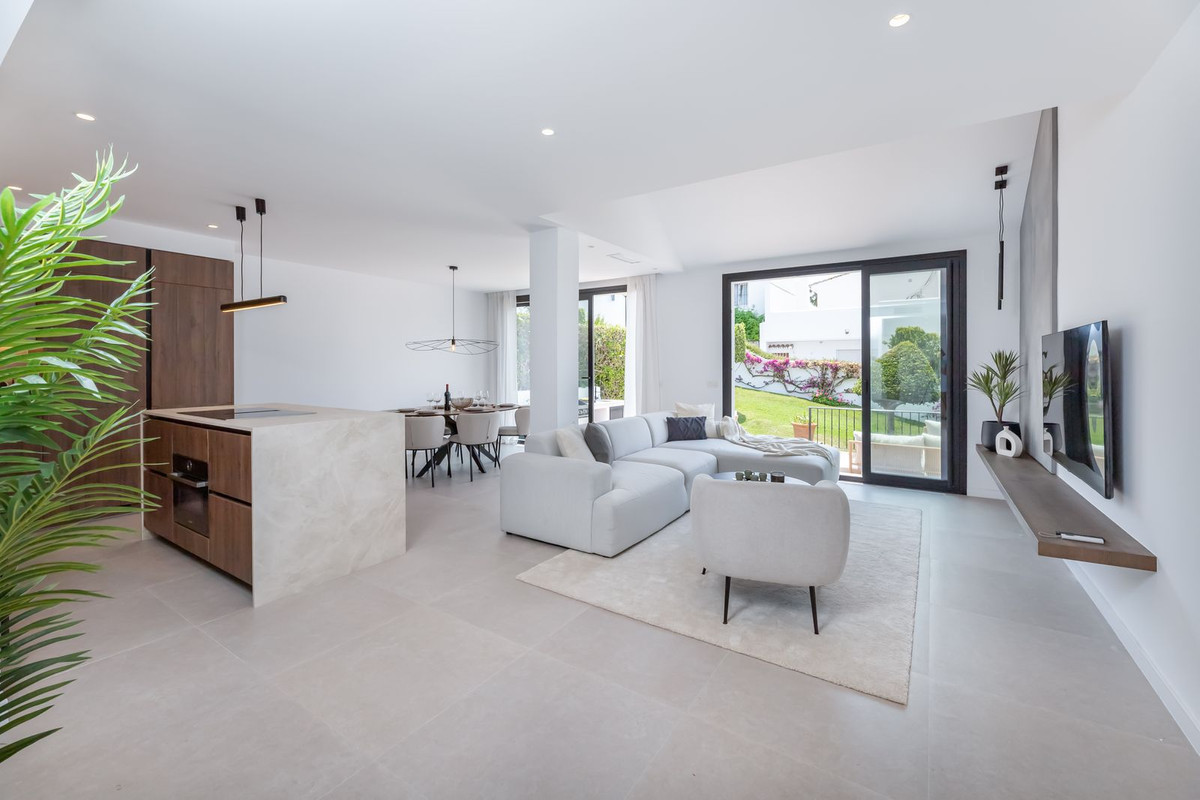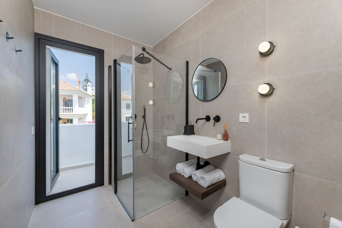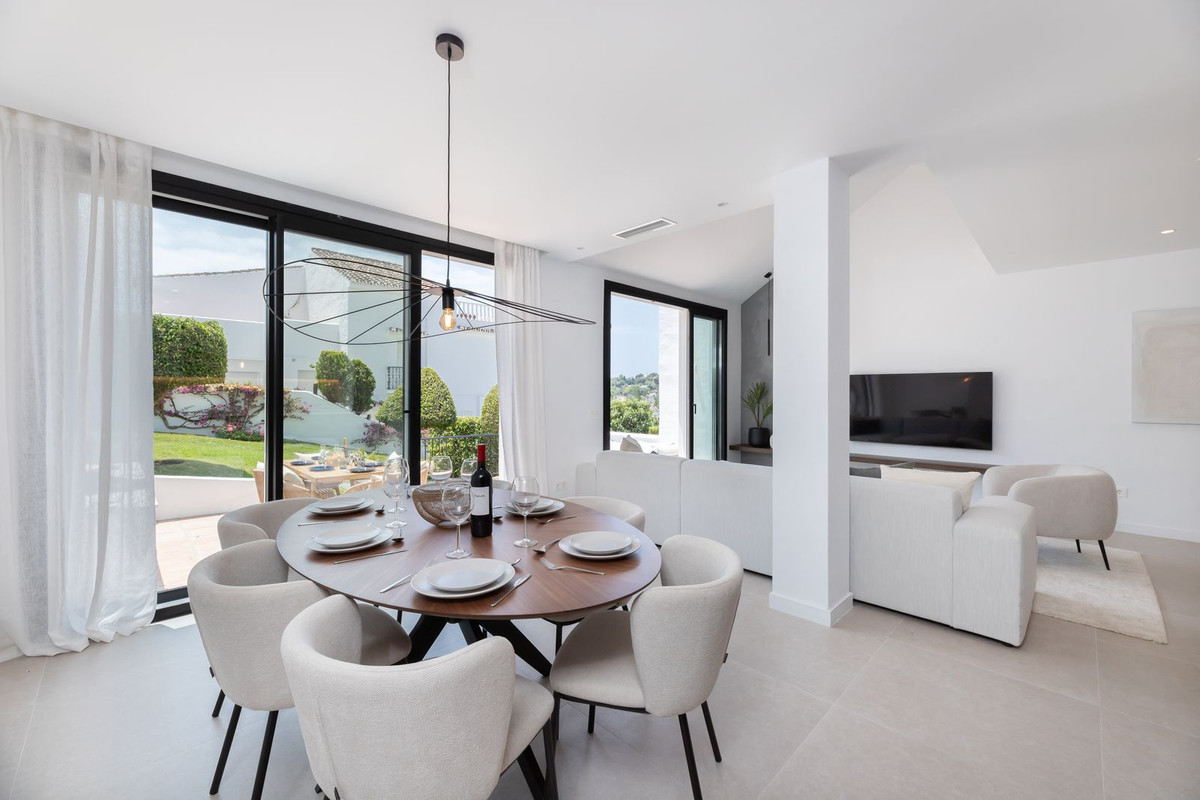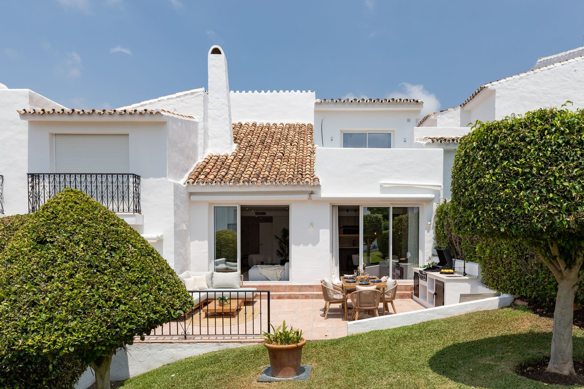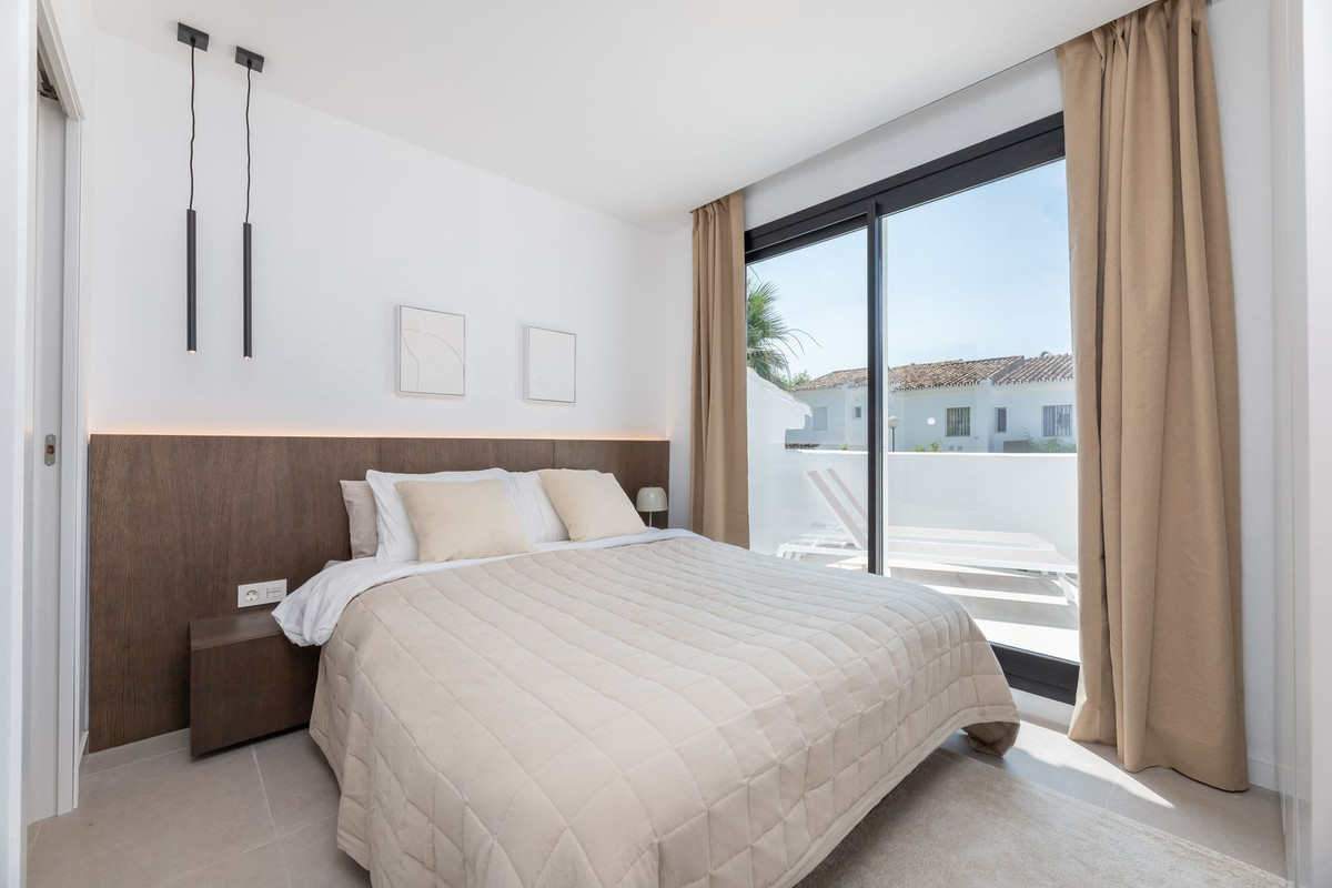 Esta moderna casa adosada de 3 dormitorios es luminosa y está distribuida en 2 plantas. La planta baja cuenta con un moderno diseño de planta abierta con una cocina totalmente equipada, un amplio salón y un comedor. Unas grandes puertas correderas dan acceso a una terraza privada con barbacoa, comedor exterior y zona de estar, perfecta para disfrutar del estilo de vida de Marbella durante todo el año. En la planta baja hay un aseo de invitados y un dormitorio con baño en suite.
