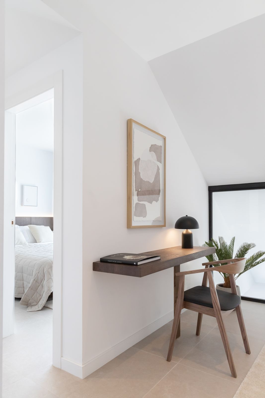 En la planta superior, encontrará dos dormitorios adicionales y dos baños. El dormitorio principal tiene una terraza privada con tumbonas y vistas a la urbanización y al valle. También hay un espacio de oficina y un sofá cama en el vestíbulo de arriba que se convierte en una cama de matrimonio, ofreciendo alojamiento adicional para invitados y espacio para trabajar a distancia si es necesario.