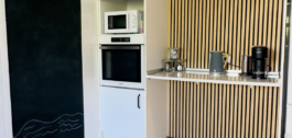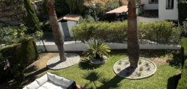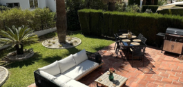 El jardín privado empapado de sol tiene 2 terrazas que conducen a una zona de césped con palmeras maduras – todo mantenido por los jardineros de la comunidad.
